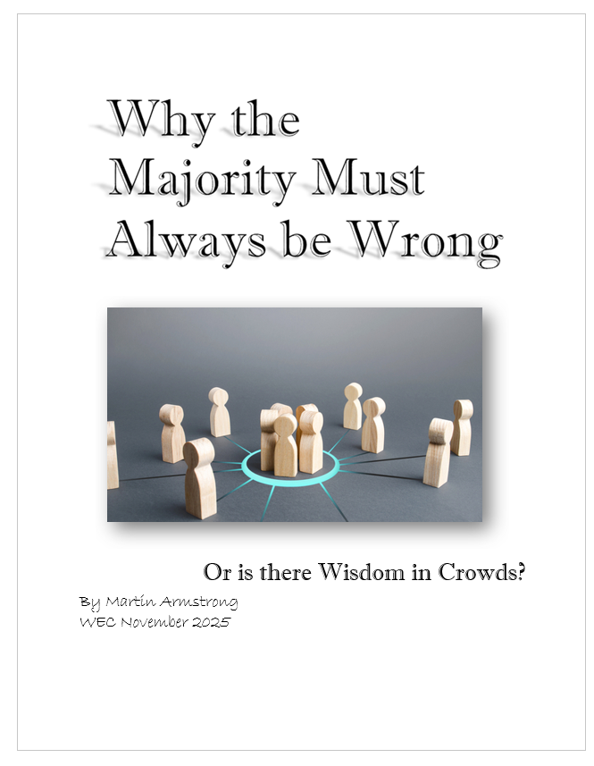We will be sending out notices for the portal where those attending the 2025 World Economic Conference (WEC) can start to pull down your materials. Since this is our 40th Anniversary, we are also including some of the handouts from the first WEC in 1985. We are including some reports on trading, such as “Why the Majority Must Always be Wrong.”