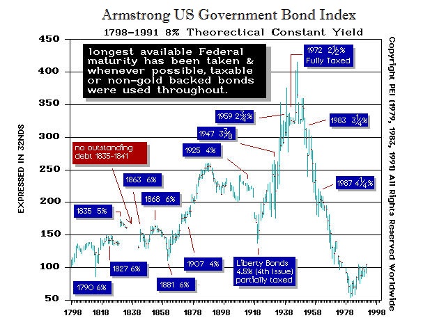 Little known to most analysts, during World War II, Congress ordered the Federal Reserve to do something similar to QE. They declared that the Fed MUST support the bond market during the war and be the constant buyer at PAR. The market went sideways during the war and what we see is a flat line. The Fed did not buy in the debt, it was just at a fixed bid.