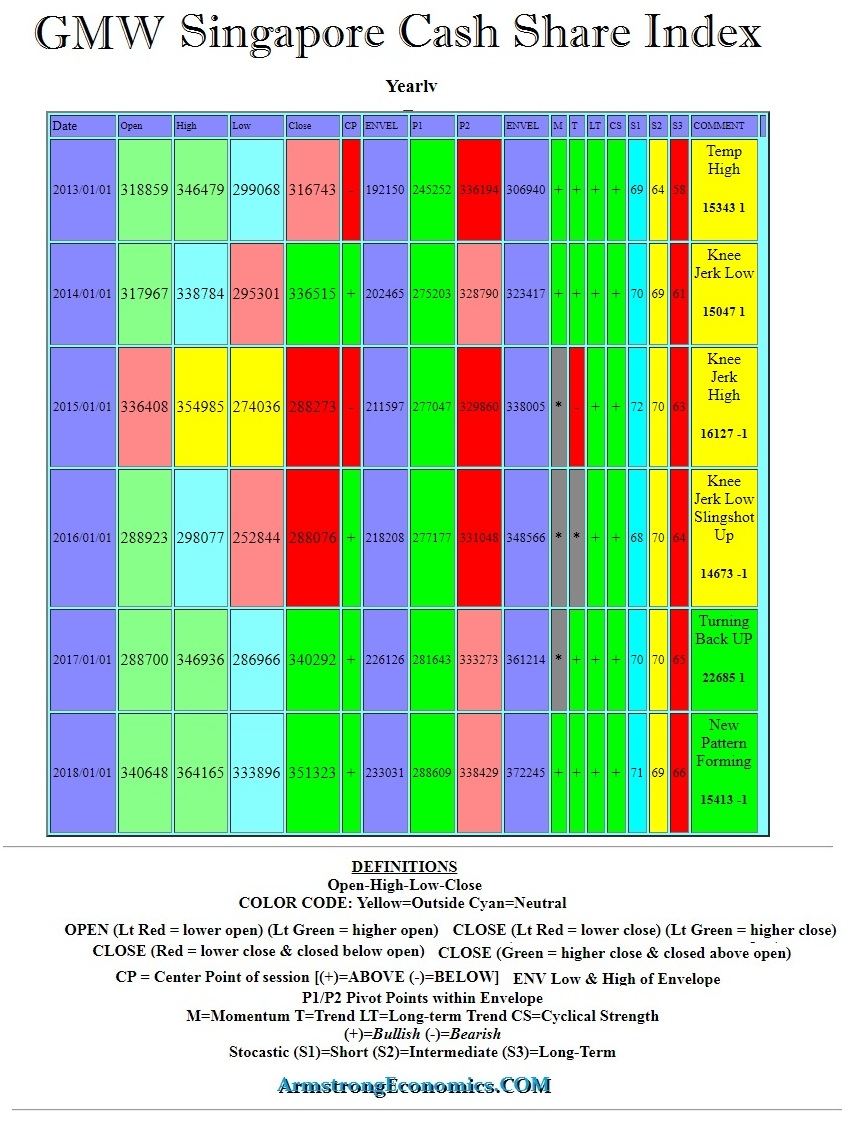 The Knee-Jerk events can be highs or lows but are confined to one unit of time. They refect choppy markets. Here is Singapore share index. Note that there were three back-to-back Knee-Jerk events. This is what the Global Market Watch is forecasting. Not necessarily a change in trend, just a choppy move normally in the opposite direction.