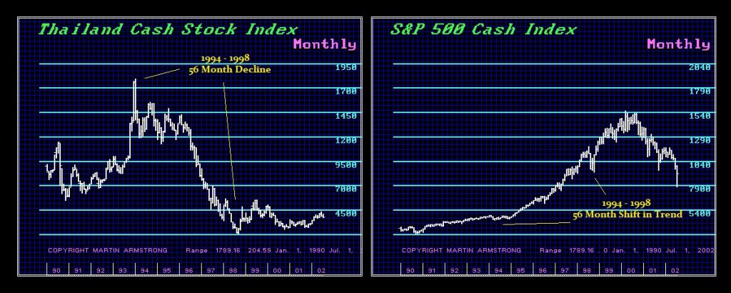 ANSWER: Keep in mind that this is the global business cycle and not based on any individual country. Therefore, we have peaks in one country and bottoms in another on the same turning point. For example, the 1994.25 turning point was the peak in the economies of Southeast Asia. Even when things do not line up precisely to the day with the ECM, the trend changes regardless. The turning point was March 1994 and here we turned in February. The correction at the end of 1998 was the Long-Term Capital Management collapse that was instigated by the loss in emerging markets, namely Russian bonds. I warned them that emerging markets peaked in 1994 and the capital flows shifted. They would not listen, invested in Russia because they assumed they bought the IMF, and when it all blew up they blamed me.
