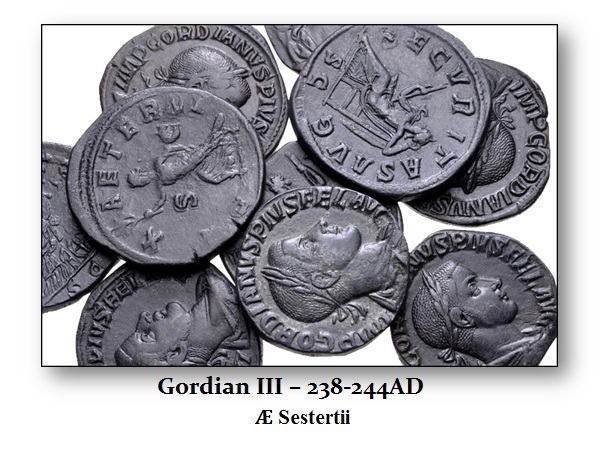 A lot a people wanted a bronze Roman Sestertius. We sold out of all the issues. The only one I had more of was those of Gordian III. This was an interesting emperor for Gordian III is where we find the last silver denarius to be issued in any quantity. Following his assassination, the dominant silver coin becomes the antoninianus which was valued at twice a denarius. So this effectively becomes a major debasement event so these coins represent the start of the fall of the Roman monetary system.