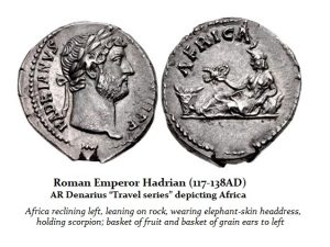 Here is a Roman coin of Emperor Hadian (117-138 AD) with a reverse depicting Africa as a female with an elephant headdress, holding a scorpion, with a basket of wheat symbolizing the Egyptian food source of grain for the world. It is symbolic like the Teddy Roosevelt statue.
