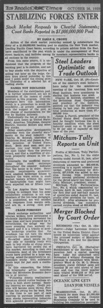 There have been attempts to create a Plunge Protection Team before. The banks got together to try to save the market back in October 1929. Here is the Los Angeles Times from October 26th, 1929 talking about the Stabilizing Forces to save the market. They failed to prevent the Great Depression.