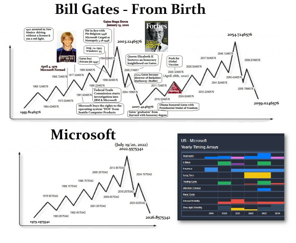 I published this forecast on Gates back on May 8, 2020. I warned back then that this was the peak of his eighth 8.6-year wave which hit April 28th, 2020. Gates’ and Schwab’s attempt to take over the world using scare tactics is a very dangerous proposition. I warned that the “ideal peak in his power may have taken place on April 28th and that is good news for us. If this proves correct, he should be in for a fall in prestige and power going into 2024.”