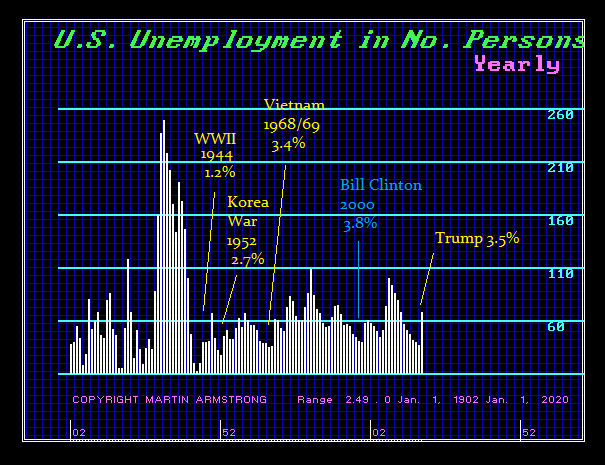 Firing all of these people would not just set in motion a new Great Depression when unemployment reached 25%, but we may see this economic decline lead to massive rioting at the exact time they need police forces. Congress would reclassify the army as a National Guard so they could police the streets even in tanks. The unemployment rate reached its historic low during peace times of 3.5%.