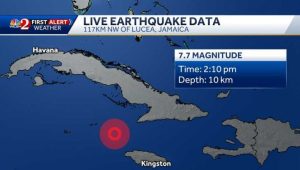A 7.7 strong earthquake was reported Tuesday afternoon in the Caribbean Sea between Cuba and Jamaica, according to the U.S. Geological Survey. The earthquake was reported around 2:10 p.m. EST Tuesday, according to officials. The quake appears to be on a fault boundary between the North American and Caribbean plates.