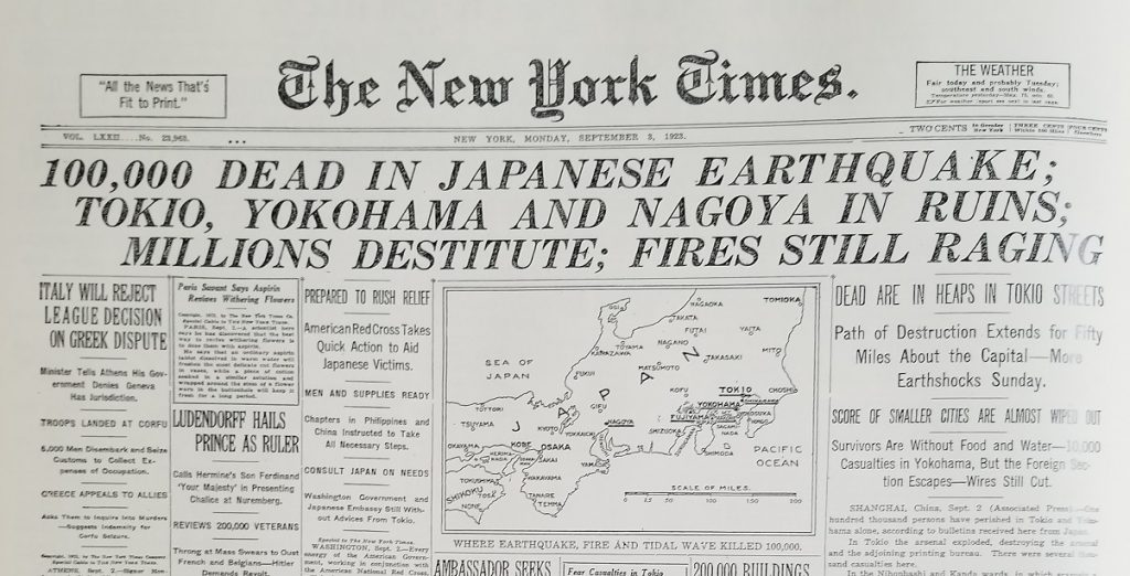 Nevertheless, the real issue is that their forecasting models were all wrong on the direction. It appears that the European model (which includes more data & takes longer to run) was doing a better job, but it too missed the turn inland. Then there were the dire forecasts that we would see a giant “surge” of a wall of water 15 to 20 feet high they painted would be like a tsunami. That too never materialized. A tsunami is a wave of energy pushing through the water. The storm surge they pictured was water simply rushing back in pushed away by wind. This type of “surge” may cause some flooding, but it lacks the energy of a tsunami. Depending upon the topography both under the water and the land, then the storm “surge” of just 3 feet (1 meter) can drown people. But that is totally different from a tsunami. An earthquake can create a tsunami as was the case with the Tokyo 1923 earthquake shown in the newspaper account above.