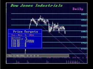 Here are the charts and Array for the election. Note that the S&P500 has fallen technically harder than the Dow Jones Industrial Index. This is the reflection of capital flows. We still see foreign capital buying dips in the US blue chips, but domestically there is the fear-mongering about a Trump victory. We have back-to-back Directional Changes for the 7th and 8th. We should see a 3 day reaction following the election.