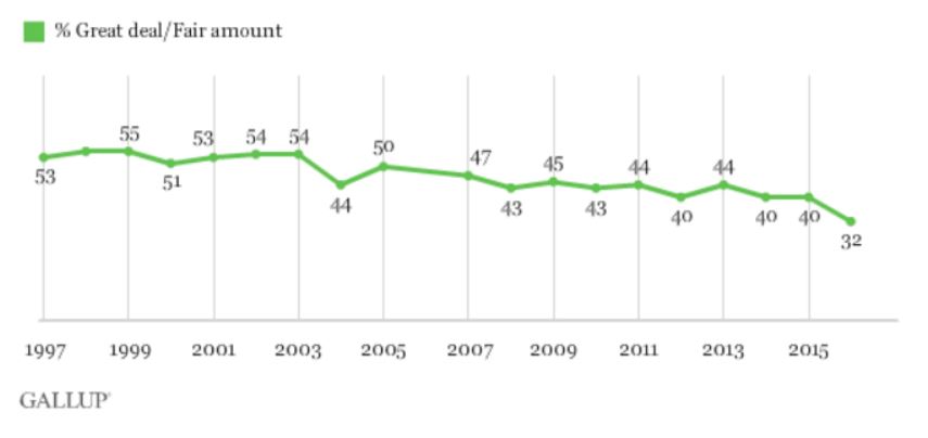 Following 2005, the trust in mainstream media dropped into the mid 40% range. It has consistently been below a majority level ever since the 2007 economic decline. However, after the 2016 election and the extreme bias for Hillary, where virtually 99% of mainstream media deliberately tried to manipulate the people to vote for Hillary, the trust factor has collapsed to 32%. When they polled just conservative Republicans, it was 14%. So the 32% level is the average American.