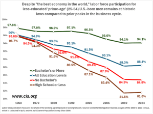 American men have been leaving the workforce. American men with only a high school degree between 25 and 54 had a workforce participation rate of 95.7% in 1960, which has fallen to 81.6% in 2024. They cannot compete with people who are willing to accept lower pay for the same positions. Even men with a bachelor’s degree in the same age range experienced a decline in workforce participation from 95.8% in 1860 to 84.8% this year. The study concluded that workforce participation rates among all prime-age men in America plummeted 8 percentage points in 64 years.