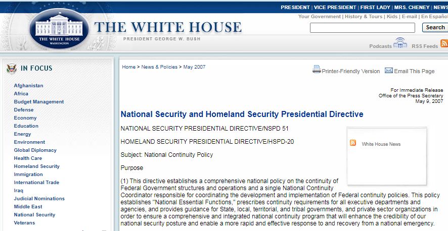 “This directive establishes a comprehensive national policy on the continuity of Federal Government structures and operations and a single National Continuity Coordinator responsible for coordinating the development and implementation of Federal continuity policies. This policy establishes “National Essential Functions,” prescribes continuity requirements for all executive departments and agencies, and provides guidance for State, local, territorial, and tribal governments, and private sector organizations in order to ensure a comprehensive and integrated national continuity program that will enhance the credibility of our national security posture and enable a more rapid and effective response to and recovery from a national emergency.”