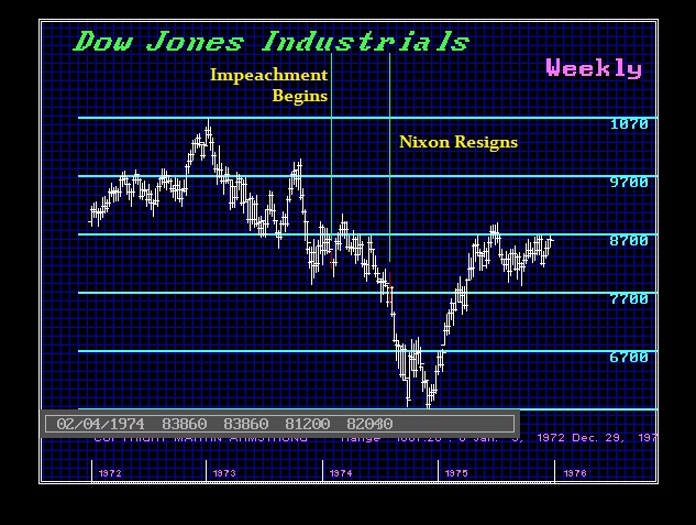 It is pointless to offer my opinion and then say it is better than anyone else. The famous saying in politics is that Everyone has an opinion the same as an asshole. That is probably the bluntest statement on the subject I have ever heard. The only thing we can do is look at what happened when Nixon was subjected to impeachment. Taking down Nixon had a profound impact and created the worst economic recession since the Great Depression. Paul Volcker commented economically on what happened with the Nixon impeachment – “[I]t was not until the events of 1974 and 1975, when a recession sprung on an unsuspecting world with an intensity unmatched in the post-World War II period, that the lessons of the ‘New Economics’ were seriously challenged.” (see Rediscovery of the Business Cycle)