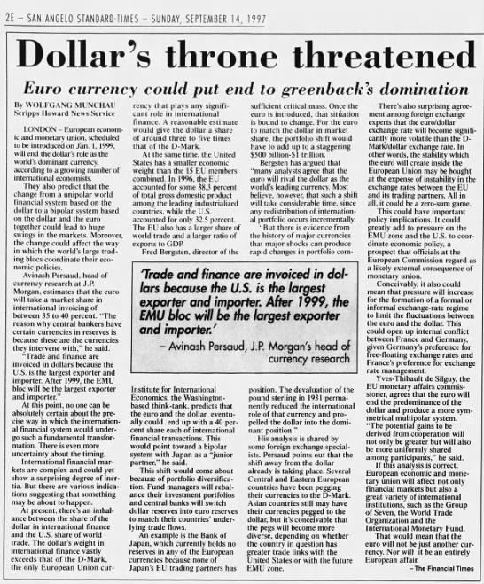 Remember 1997? The Euro was going to dethrone the dollar. They claimed the new EU will be a bigger economy than the US. The problem was, they lacked a consumer economy, and low taxes, and they routinely canceled their currency to force people to pay taxes. It is always the same story over and over again.