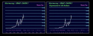 Compare the German stock market in euros and in dollars. It has finally made new international highs only in 2015. We have to look at everything from a global perspective. The new highs in the Dax in international terms is ONLY because of the decline in the euro. With the bounce in the euro, the Dax will rally in euros, but only to a point.