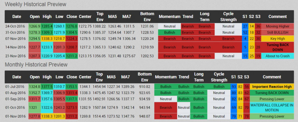 QUESTION: Marty; I find the Global Market Watch really amazing. The talk of India banning gold imports could lead to a crash you have warned about under $1,000. The weekly level in gold came up and said about to crash and even caught the high the week of 07 November. The monthly also caught the high and said it was important back in July. But the monthly level at the close of October said a waterfall in motion. It seems like the GMW can even anticipate fundamentals. I really do not understand how the gold bugs keep attacking you. It appears they enjoy losing.