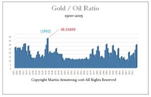 Here is the gold/oil ratio back to 1900. The record high is neither 1980 nor the 1973 OPEC crisis. The record high was 1932 and the Great Depression. This is calculated by simply using annual closings. On that basis, we have not reached the Great Depression high. If oil fell to the reversal at $25, to test the Great Depression high on this ratio, gold would still fall to $875. The average is about 23:1; not 15:1. If gold were really to respond in a financial crisis to a collapse in money stock, then this ratio could hit the 52:1 area. That would be something to write about. We should exceed the 1932 high on this move.