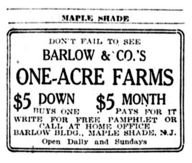 The town I grew up in, Maple Shade, New Jersey, was once the sprawling real estate speculator’s paradise. Thomas Barlow, Sr. and his son, Thomas, Jr. formed the Maple Heights Land Co. together with several other businessmen in 1908. The company purchased from John R. and Margaret W. Mason their farm which was part of the original Roberts plantation surveyed in 1682. In 1910, they formed Barlow Company and began selling 1 acre lots. The buyers were the city folks in Philadelphia for the train came right into Maple Shade and that made the area worth speculating in.