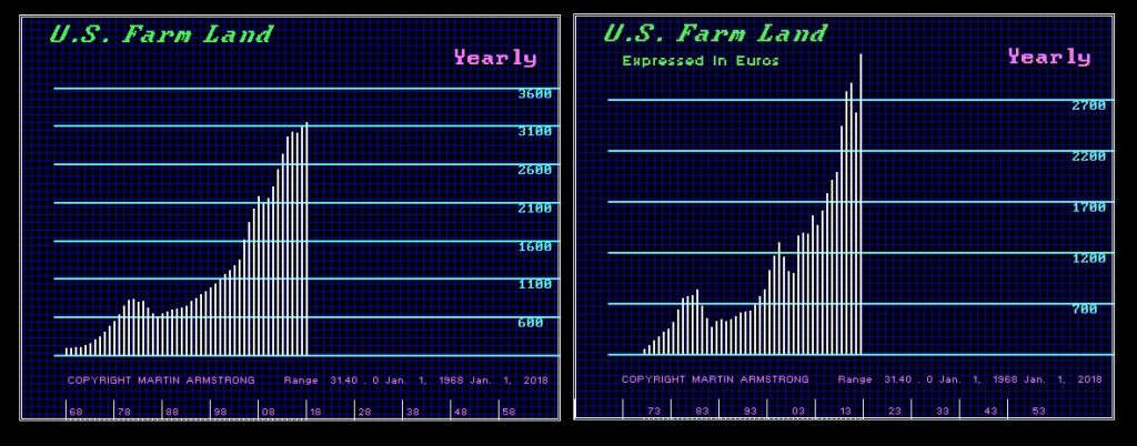 When we look at the Array, we see turning points lining up for 2020/2021 and 2024 followed by 2026 and then 2028. The commodity cycle appears to be pointing to 2024. That is when we should see farmland values peak in real terms but keep in mind that it will all depend upon the particular region. The weather is going to kick in and that will reduce crop yields. Keep in mind that most of these REITs have entered this sector of the market for the wrong reason. It was not truly a commodity boom expectation as it was simply to get a 5% yield when interest rates were below that level. As interest rates rise above that 5% threshold, we will begin to see the big players bailout and begin to dump farmland at losses. Anyone looking to borrow against their land should use FIXED RATES only. If you decide to sell your land to the big boys while rates are still below 5%, the include a right of first refusal to buy it back at a reduced price when they decide to cut and run – which they will inevitably always do at the precise wrong time.