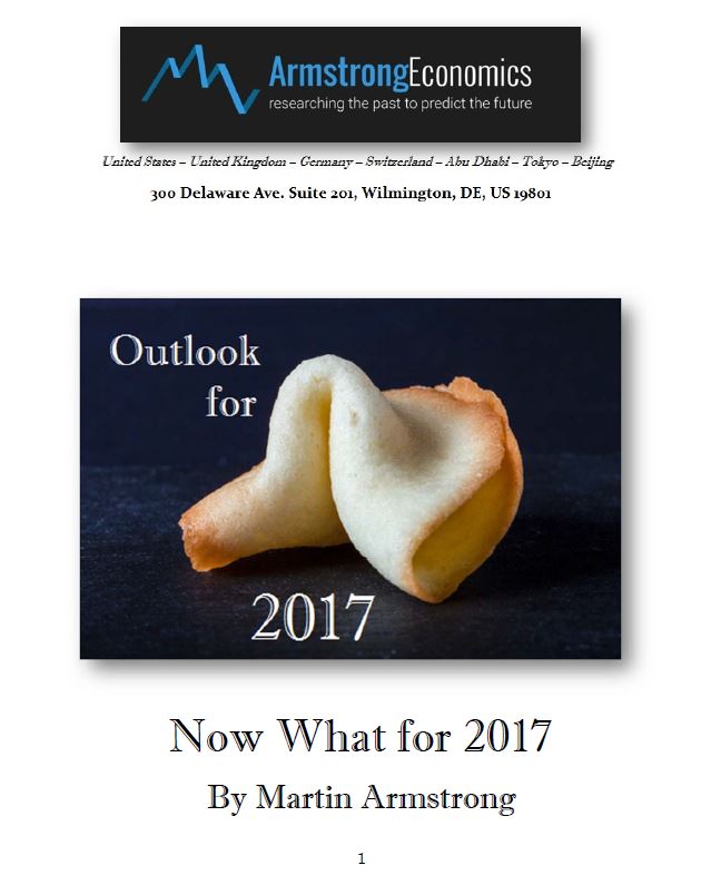 Prepare for the what will unfold in the new year by purchasing the “Now What — 2017” report. Review the events that occurred throughout the world in 2016 that will impact us as we move forward. Written from a global perspective, this annual analysis includes chapters on the euro, Germany, Britain, Canada, Japan, Russia, China, Mexico, and South America. Included is a global table on the yearly level for all major world markets that includes 2016 closings, buy and sell signals for annual closings, trading prices (as of the completion of this report), resistance, support, and the historical high and low of each market.