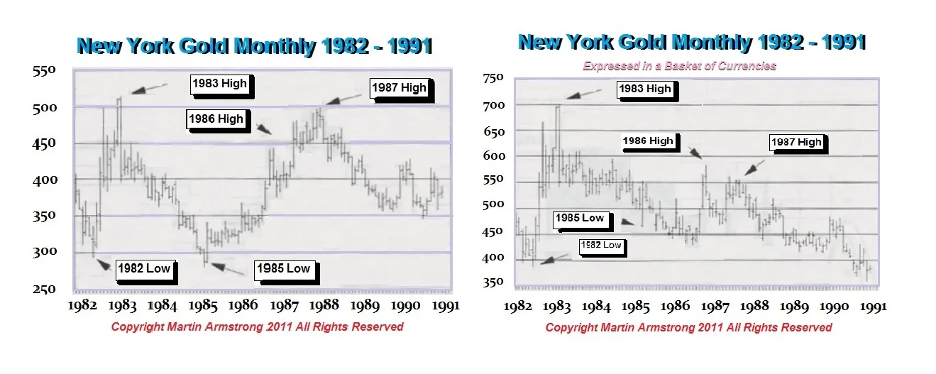 We published charts back in Barron’s during the early 1980s showing gold in dollars compared to a basket of currencies. We ended up with the largest institutions in the world because our reports went out on telex and the communication costs per market were $225 per day. Only the biggest institutions could afford our services. Then came fax, and then email which has expanded our reach to everyone these days. But make no mistake about this. People may criticize me and others are desperate to try to prevent people from using us. It is either because they cannot compete and pretend this is my opinion rather than a computer, or they want to manipulate the markets and we just get in their way.