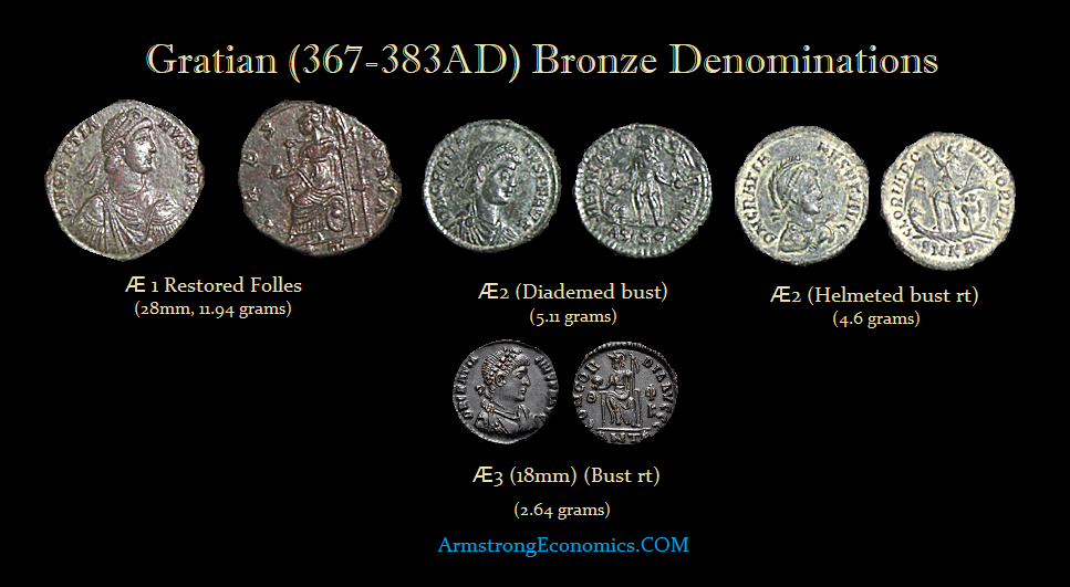 Gratian introduced reform to the bronze coinage around 379 AD. In addition to Valentinian I’s AE3 denomination, Gratian introduced its double, the AE2, and its half denomination, the AE4. The average weights were thus AE2 4.5, AE3 2.3, and AE4 1.49, which closely resembled the weight standards used in the silver coinage from the Miliarense, the Siliqua, and Half-Siliqua. Hoard evidence suggests that the AE3 was the most common bronze denomination. This reform of Gratian prevailed for the most part until the bronze reform of Theodosius I. However, following his death, while the denominations remained constant, the weights were reduced to AE2 4.5, AE3 2.27, and AE4 1.13 sometime between 383 – 386AD.