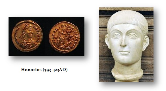 Flavius Honorius was the younger son of Theodosius I and Aelia Flaccilla. Honorius was born in 384 AD and was raised to the rank of Augustus in 393 AD. Upon the death of his father Theodosius in 395, the Empire was divided in two with Honorius receiving the throne of the Western division of the Empire while his brother Arcadius succeeded to the throne in the East. Like his brother, Honorius inherited none of his father’s abilities. The real power rested in the hands of his guardian Stilicho, whose daughter, Maria, he married in 395 AD.