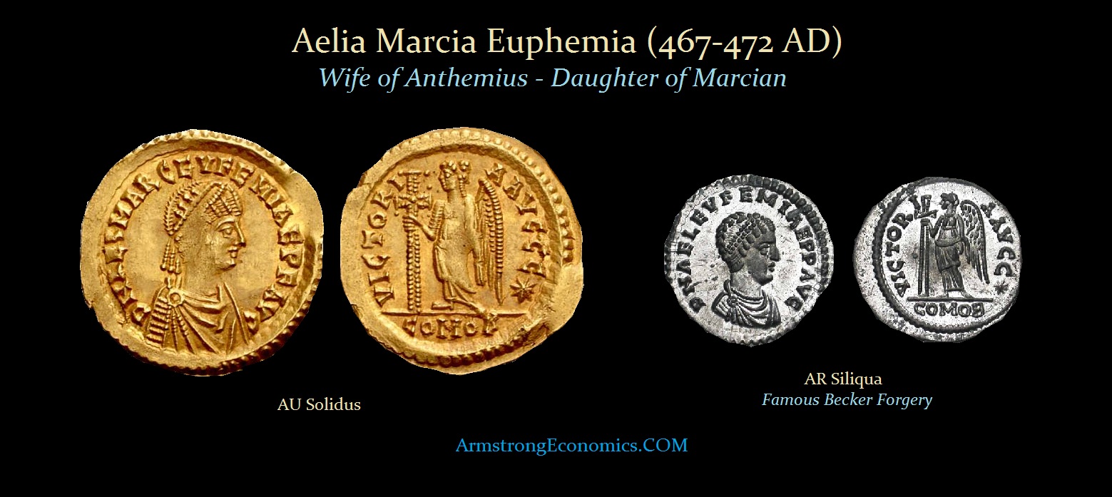 Euphemia was married to Anthemius in 453AD, a union that resulted in four sons and a daughter. Marcian prepared to have Anthemius as his successor. Following Euphemia’s marriage to Anthemius, he was appointed a Comes rei militaris and sent to defend the Danube frontier in the aftermath of the death of Attila the Hun.