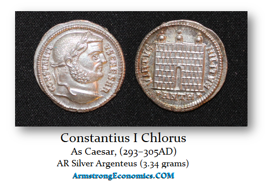 NOTE: The monetary system as employed by Constantius I was that of Diocletian’s Reform.The early issues of the silver argentius display a large wide flan with a weight of about 3.2 grams. This coin quickly became reduced in diameter and weight dropping under 3 grams fairly quickly. The portrait styles became fairly idealized for all members of the Tetrarchy in an attempt to display a unity among the two Augustii and two Caesars.