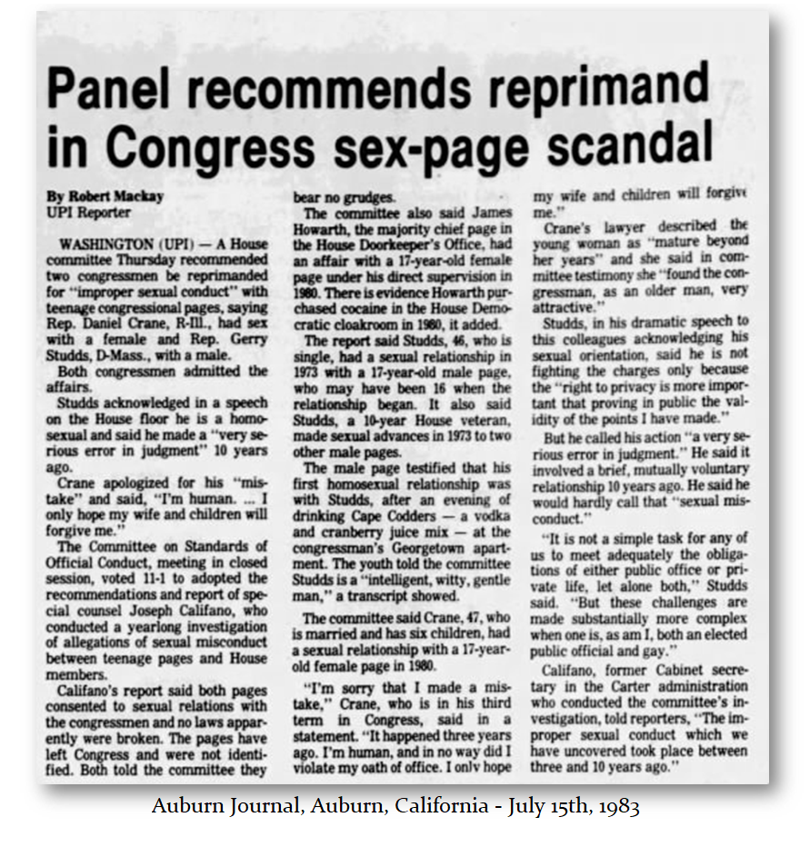 As I have said before, if a woman wears a black-leather mini-shirt and stiletto heels, you better be well informed that is the typical uniform for a professional member of the guild. This is the real world even in DC. Perhaps you can check history, but in 1983 there was the Congressional Page Sex Scandal was a political scandal involving members of the United States House of Representatives having homosexual relations with their pages.