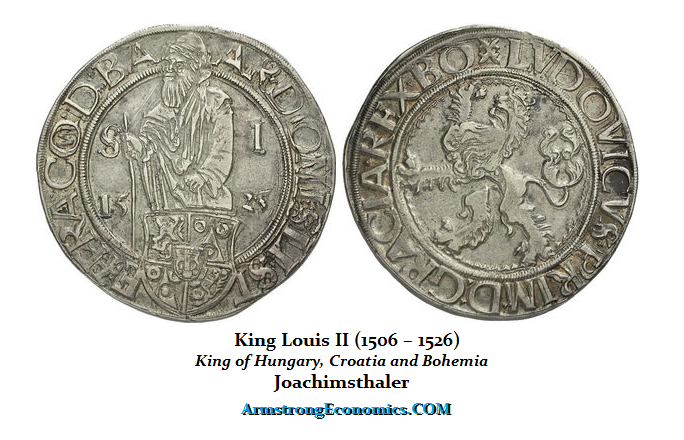The Fuggers emerged as the leading Augsburg merchant-banker, who then provided loans to local rulers secured with the produce of their mines. Eventually, by 1525, the Joachimsthaler of the Kingdom of Bohemia was the first thaler. The obverse side pictured St Joachim. It was this silver which became the leading currency in Europe and the name origin of the dollar. Fugger had no regard for religion so he pursued business based entirely on profit. They say at the time of his death in 1525, Jacob was worth in cash almost 2% of the value of the entire European economic output. He may have been the second richest man in history behind the Roman Emperor Augustus (27BC-14AD). He was the first truly documented millionaire, in thalers. Yet Jacob had devised perhaps the first modern news service which others would imitate. This was a means by which Jacob devised a way to ensure he had important information before his rivals which predated newspapers by about five decades.
