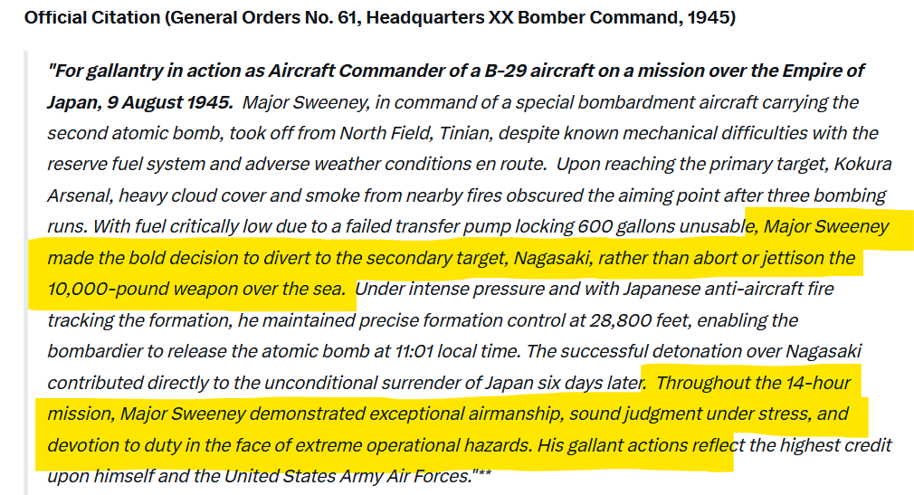 The mission to bomb Nagasaki was never expressly authorized by Truman and it was never a primary target! Kokura was the target, but the city was obscured by smoke and haze from a conventional bombing raid on a nearby city the previous day. They made three bombing runs over the city but could not visually sight the target as per their strict orders. At best, Nagasaki was a secondary target. Sweeney, the pilot, pressed on with the mission’s core objective despite a cascade of failures that would have justified an abort. He was solely responsible for the decision to use or abandon the only other operational atomic bomb in the American arsenal at the time dropping it in the ocean. There has always been this question did Truman issue a subsequent erased stand-down order countermanding the discretion of the military.