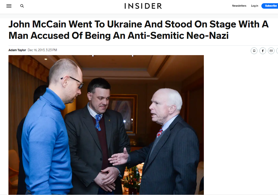 McCain was openly meeting with the Neo_nazis and encouraging them that the US will support them to wage war on Russia. As soon as Trump was elected in November 2016, McCain ran to Ukraine and promised full support to wage war against the Russians in the Donbas. In December 2016 he was openly meeting with the Neo-Nazis.