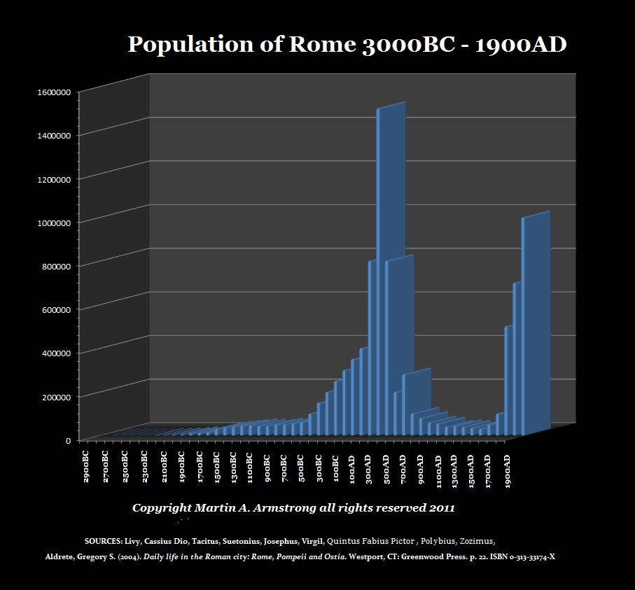 I have stated numerous times that the purchasing power of the Roman denarius collapsed to the point it purchased 1/50th of its previous worth. The German Hyperinflation was 170 marks to the dollar at the beginning to 87 trillion. To compare this with the fall of Rome with money dropping to 1/50th of its former value, that is only 170 to 8500. Rome did not go the way of hyperinflation. It was the CORE economy and it collapse at 170 to 8500 level not 170 to 87 trillion.